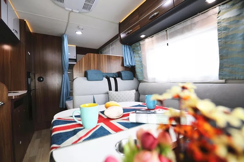 驾驶室上方双人床,卡座与升降餐桌组合成榻榻米,车厢后部纵置双人床,可满足多人睡眠需求。